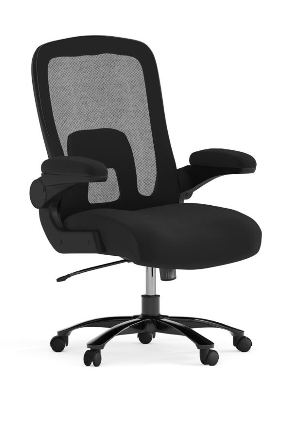 HERCULES Series Big & Tall 500 lb. Rated Black Mesh Executive Swivel Chair with Fabric Seat and Adjustable Lumbar BT-20180-GG Big & Tall office chairs are designed to accommodate larger and taller body types. This chair has been tested to hold a capacity of up to 500 lbs., offering a broader seat and back width. High back office chairs have backs extending to the upper back for greater support. The high back design relieves tension in the lower back, preventing long term strain. The breathable mesh material allows air to circulate to keep you cool while sitting. The contoured backrest features a knob to adjust the firmness provided to your back. The contoured seat dissipates pressure points for greater comfort. The waterfall front seat edge removes pressure from the lower legs and improves circulation. Chair easily swivels 360 degrees to get the maximum use of your workspace without strain. The pneumatic adjustment lever will allow you to easily adjust the seat to your desired height. The flip-up arms are great for users who like the option of an armless chair without the hassle of detaching them. The heavy duty metal base is constructed to withstand daily use.