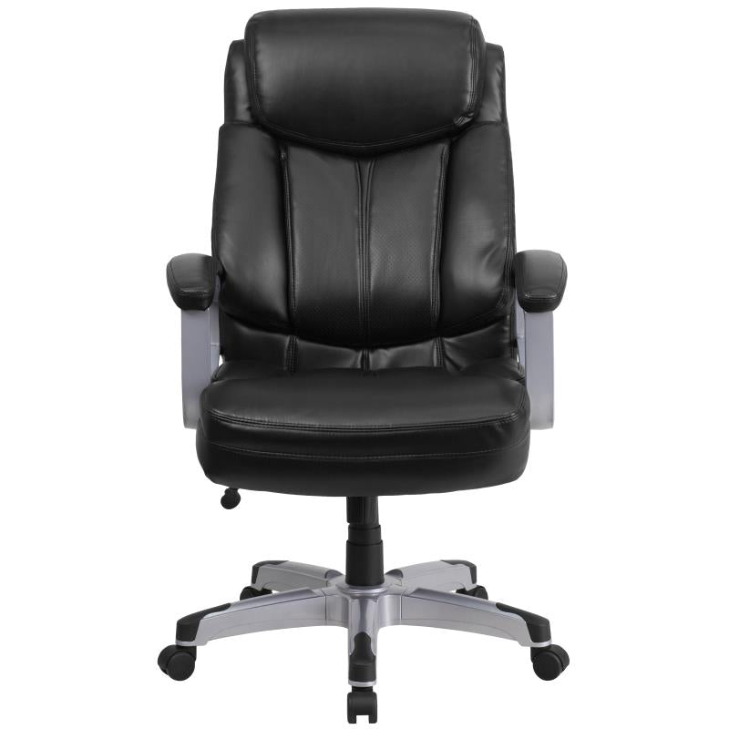 Finding a comfortable chair is essential when sitting for long periods at a time. Big & Tall office chairs are designed to accommodate larger and taller body types. This chair has been tested to hold a capacity of up to 500 lbs., offering a broader seat and back width. High-back office chairs have backs extending to the upper back for greater support. The high back design relieves tension in the lower back, preventing long-term strain. This office chair features plenty of thick, plush padding to provide greater support. The waterfall front seat edge removes pressure from the lower legs and improves circulation. The chair easily swivels 360 degrees to get the maximum use of your workspace without strain. The pneumatic adjustment lever will allow you to easily adjust the seat to your desired height. The silver nylon capped metal base with black caps prevents feet from slipping when resting on the chair's base.