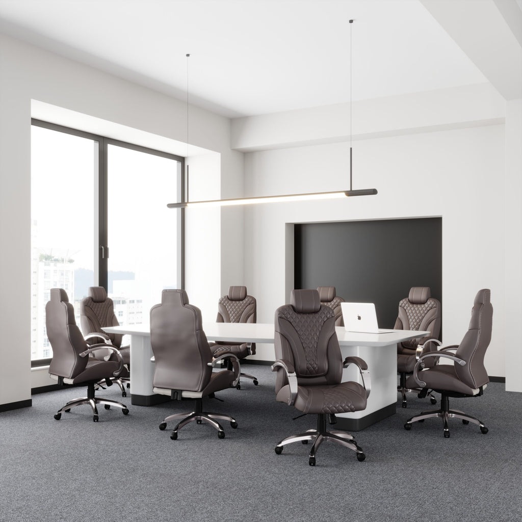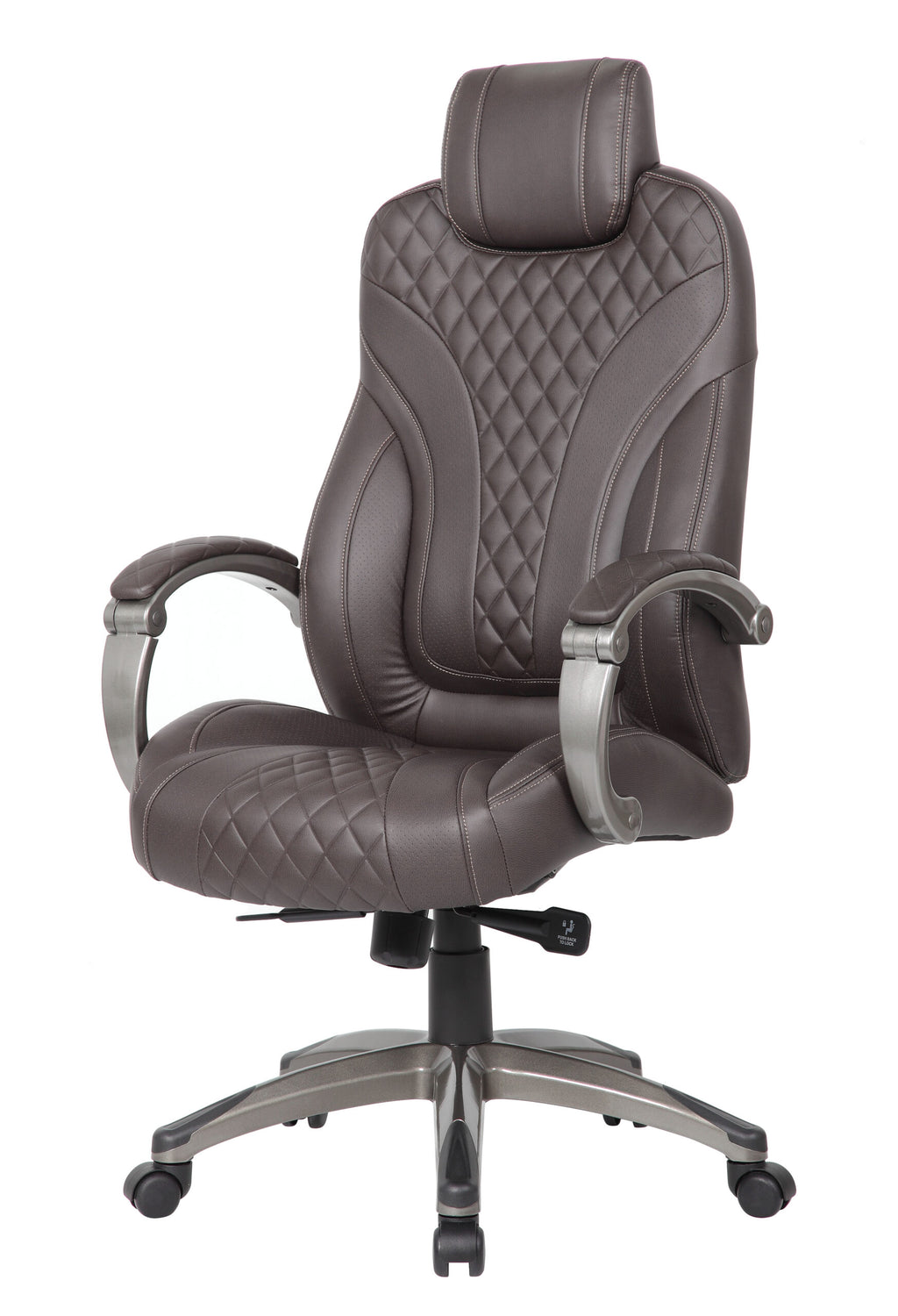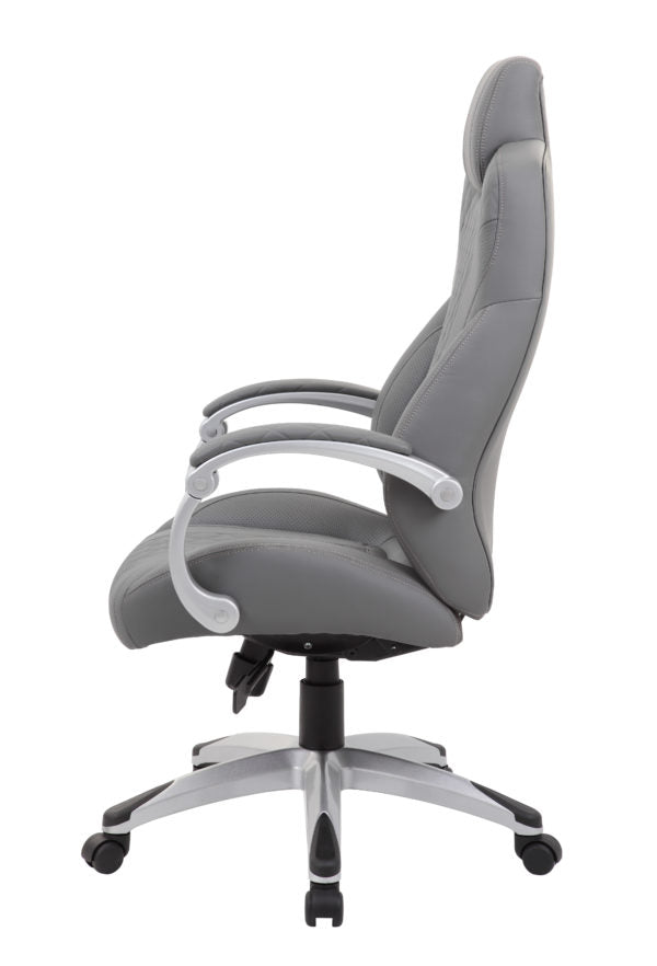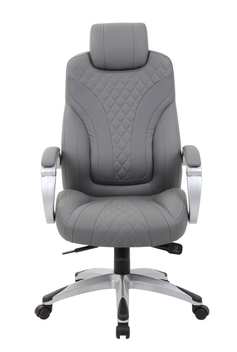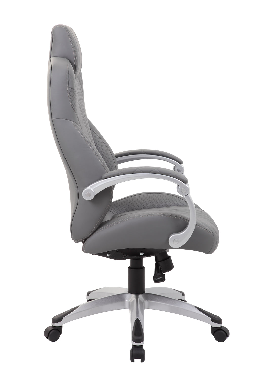 This hinged arm executive chair is beautifully upholstered in grey Caressoft upholstery for the kind of comfort and durability required for a long day at the office. It features a designer stitched back cushion and pivoting hinge arms that allow the seat and back to move independently in tandem with the 2-to-1 synchro-tilt mechanism and adjustable tilt tension control. The chair’s seat tilt allows it to be locked in any position within the tilt range for a truly personalized seating experience.