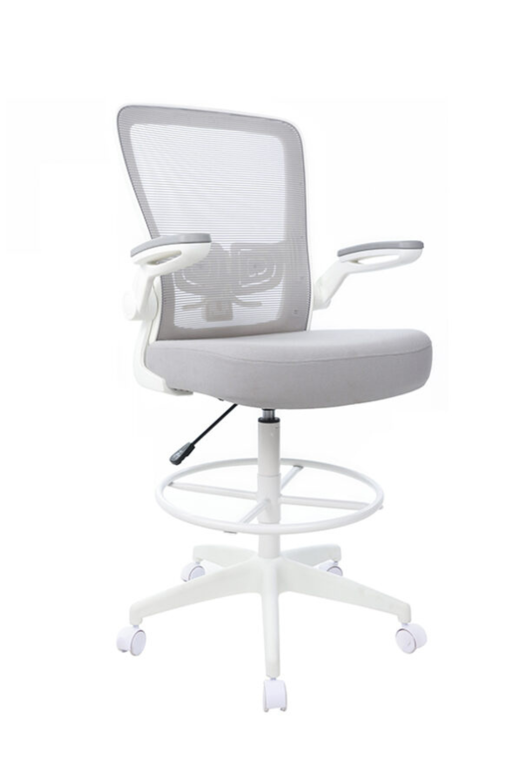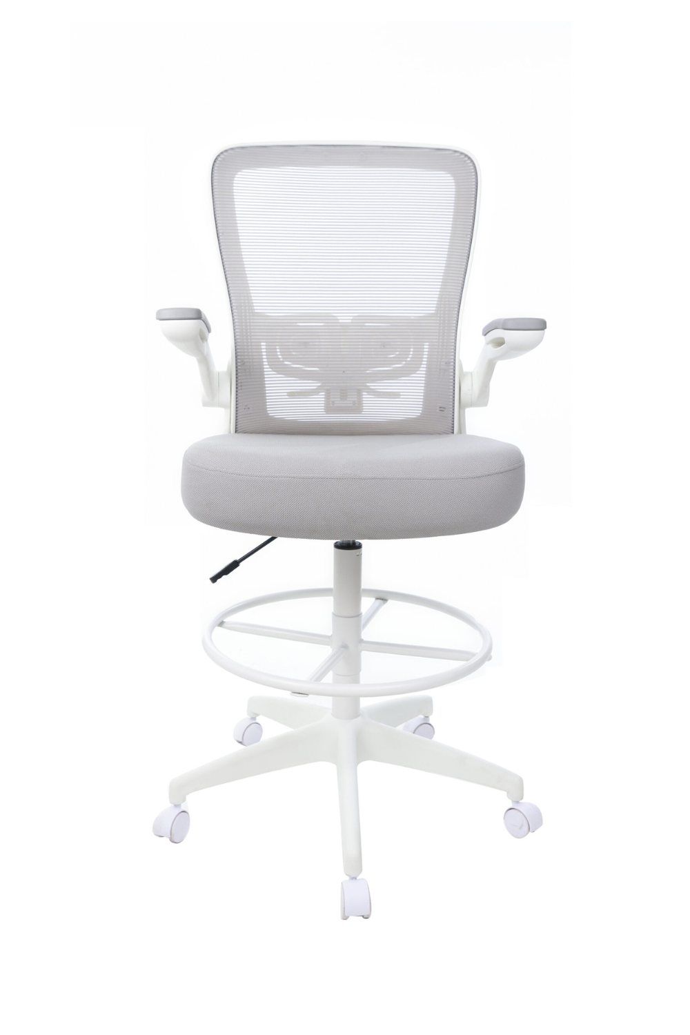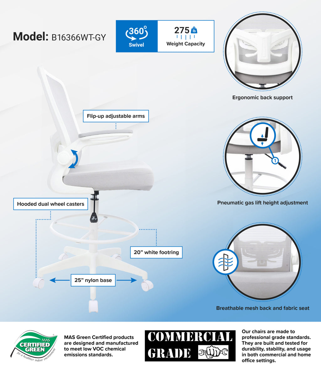 The ergonomic designed stool prioritizes comfort and convenience. Its backrest is crafted with a horizontal mesh, upholstered in linear black mesh for breathability. The seat is foam-padded and covered in soft touch black fabric for added comfort. The pneumatic adjustable gas lift allows for easy seat height adjustment, to help you find the personalized sitting style that suits you and your work environment. The 20-inch chrome footring provides added foot and leg support. The 25-inch nylon base provides added stability to the chair by spreading the load over a larger surface area. The hooded double wheel casters make it easy to move and shift directions. 275 lb weight capacity.